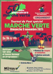 À l’occasion du 50ᵉ anniversaire de la Marche Verte, l’association Franco-Marocaine des Mureaux organise une manifestation sportive conviviale le dimanche 9 Novembre 2025, sous le thème « Marche Verte », un tournoi de football placé sous le signe du fair-play