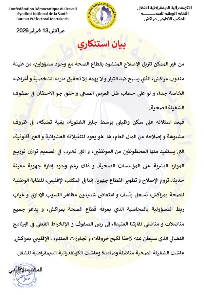 وختم البيان بالتأكيد على استمرار النضال دفاعًا عن حقوق الشغيلة الصحية وتحسين أوضاع القطاع، تحت شعارات تؤكد صمود العاملين ووحدة الصف النقابي.